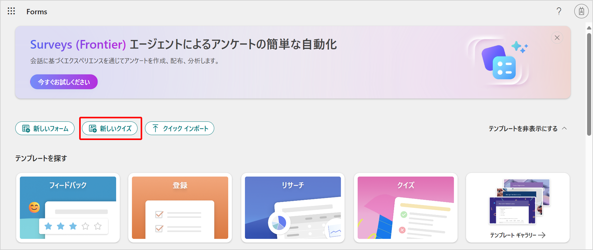 1.Microsoft Formsにアクセスして[新しいクイズ]をクリックし、クイズ作成画面に遷移します。