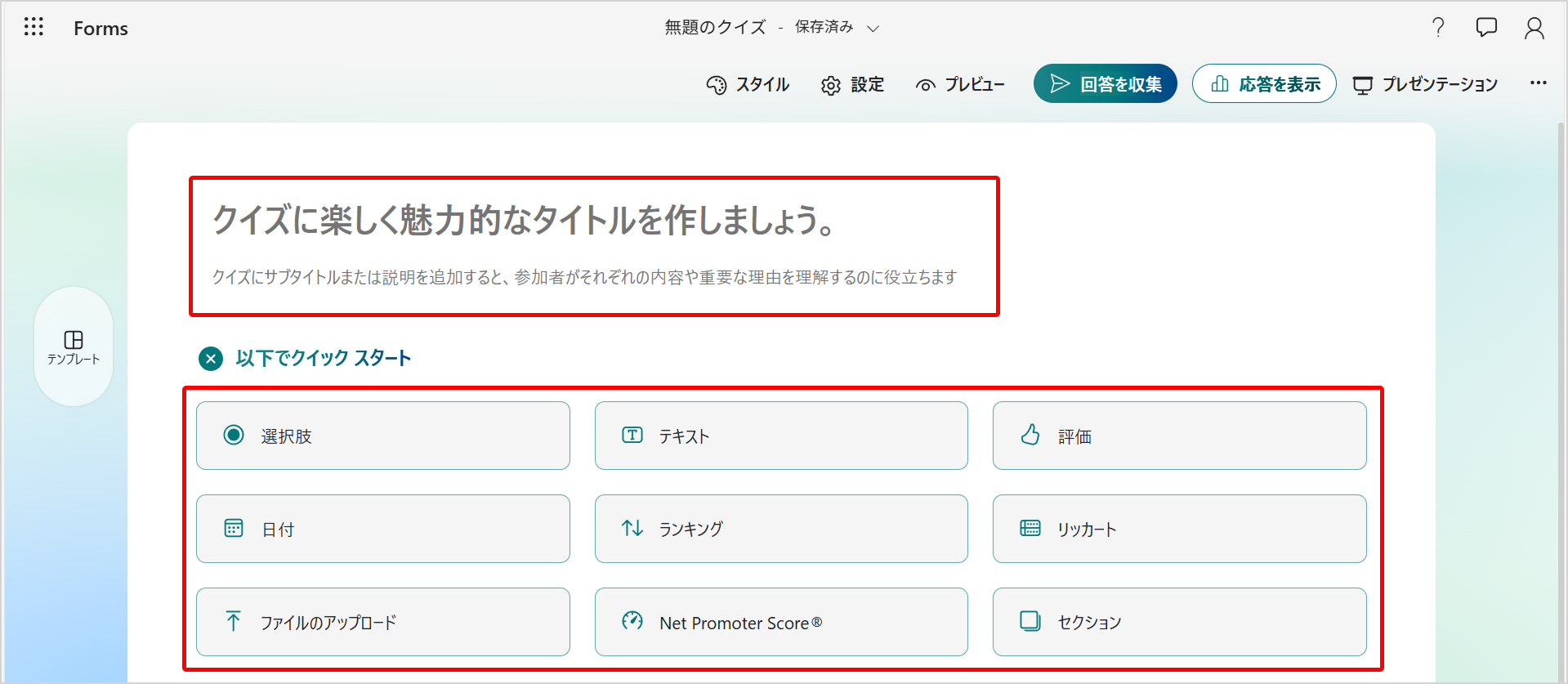 3.クイズの作成が完了したら、画面右上の[回答を収集]をクリックし、共有形式を選択します。