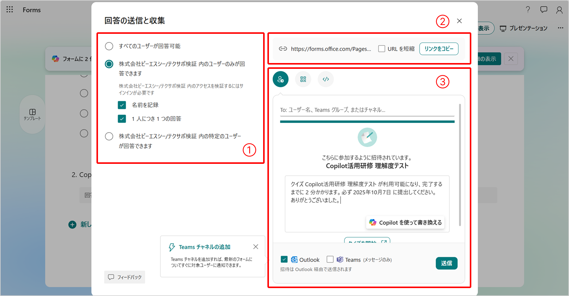 ①回答できるユーザーの範囲を選択②リンクをコピーして共有③ユーザーやグループを選択し、OutlookやTeamsで共有※共有時の文章は手動もしくはCopilotで修正可能です