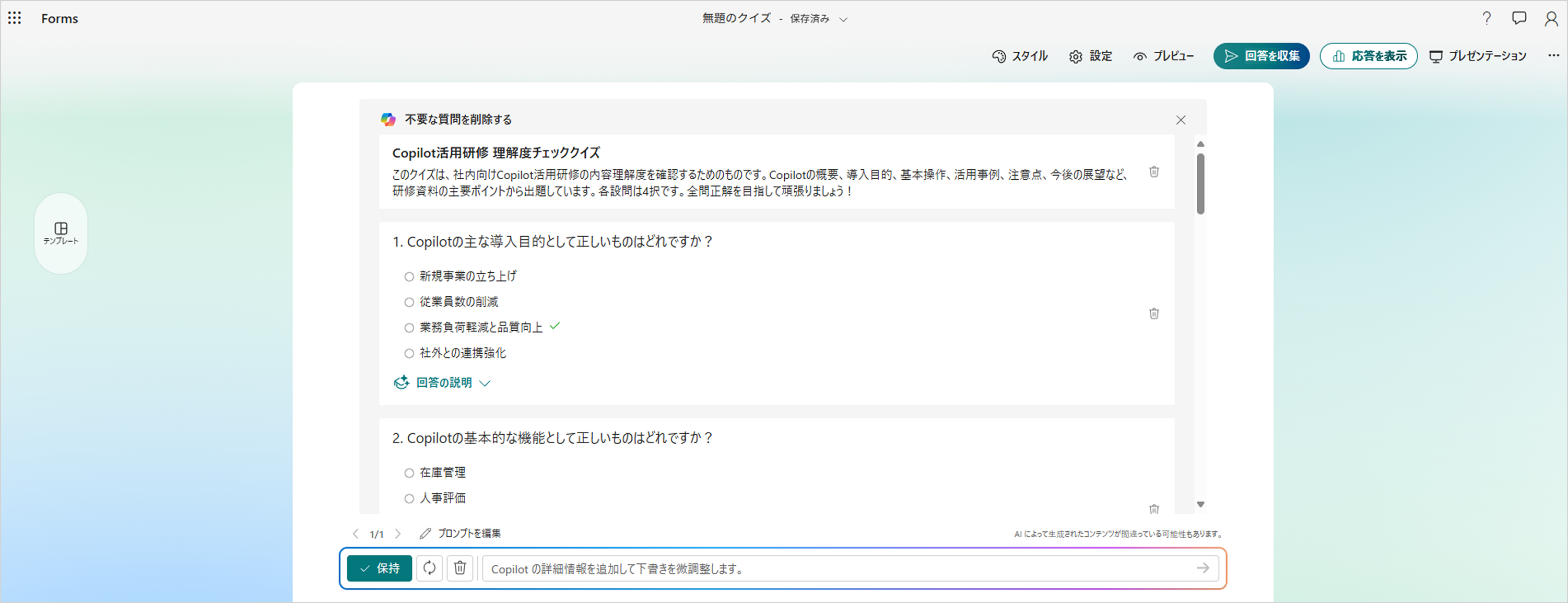 3.資料の内容をベースとして、プロンプトに沿ってクイズを生成してくれます。[保持する]をクリックするとタイトル等も含めて保存されますが、追加のプロンプトを入力して調整することも可能です。