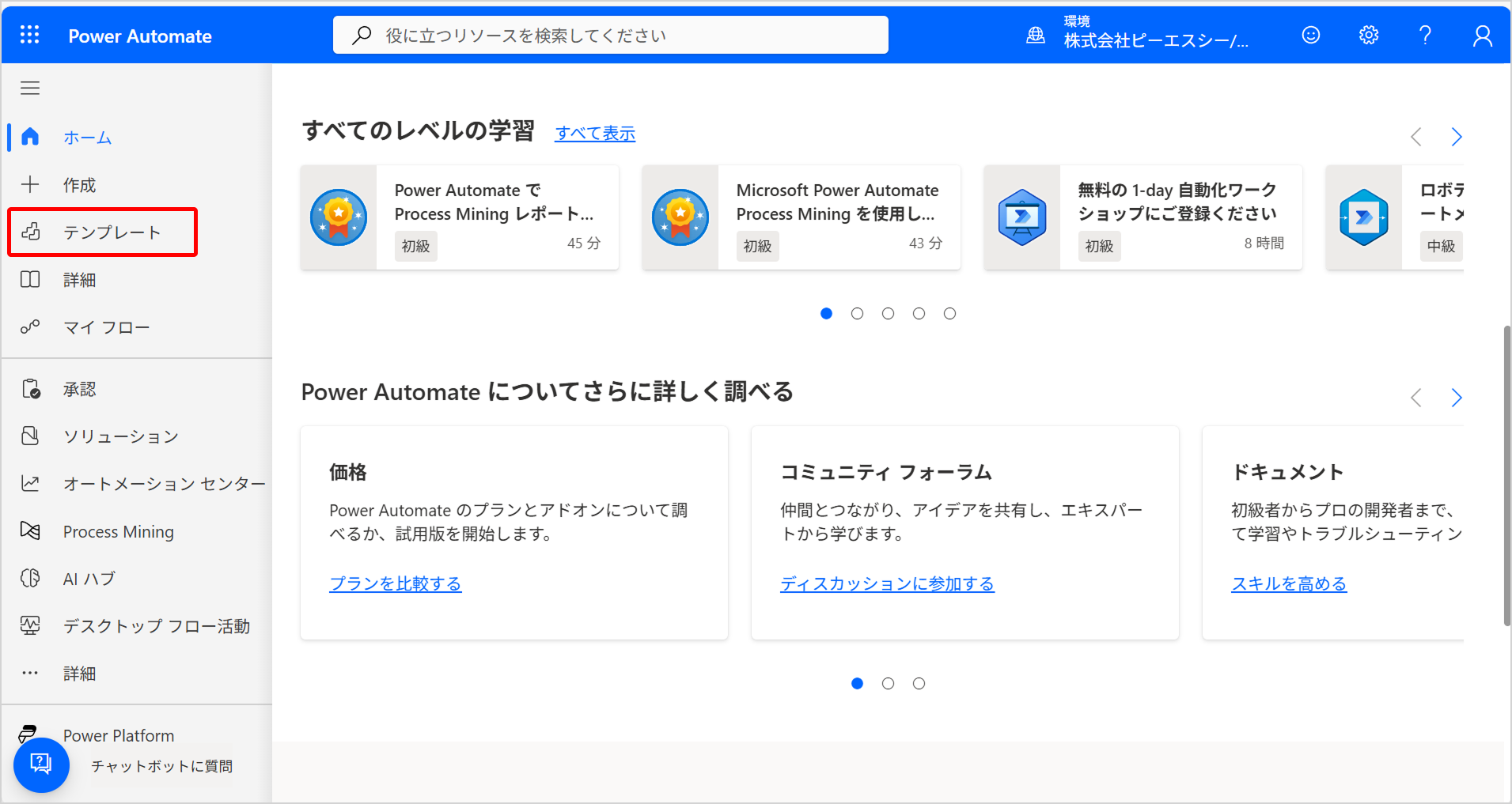 1.Power Automate を開いたら左上の[テンプレート]をクリックします。