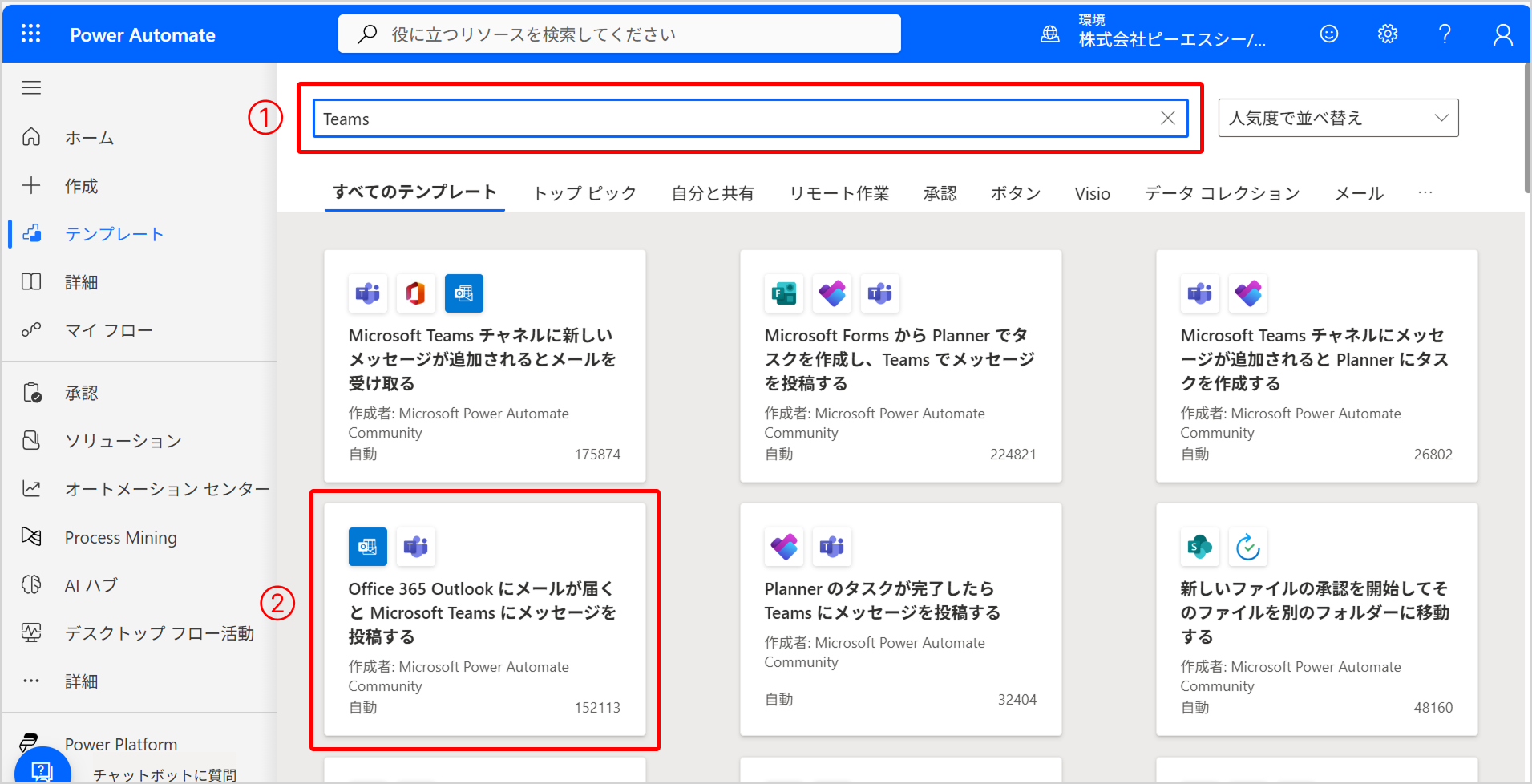 2.テンプレートの検索ボックス(①)に「Teams」(もしくはOutlook)と入力して検索します。そして、[Office 365 Outlook にメールが届くと Microsoft Teams にメッセージを投稿する](②)というテンプレートをクリックします