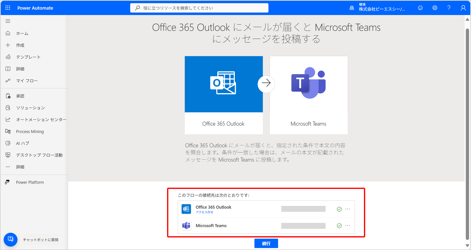 3.画面下部にOutlookとTeamsの接続先が表示されます。自分のメールアドレスが表示されていることを確認し、緑のチェックマークが出ていたら[続行]をクリックします。