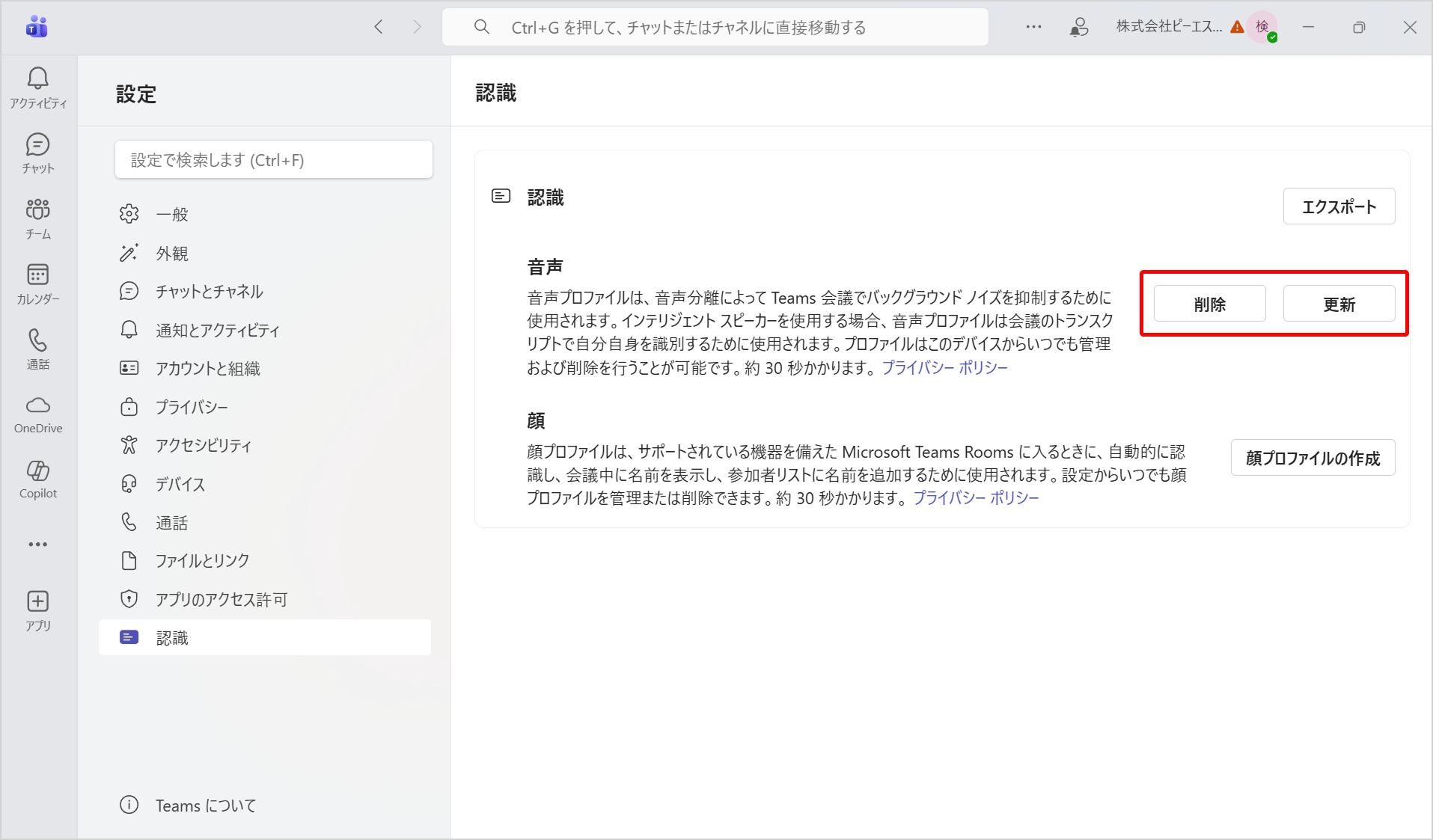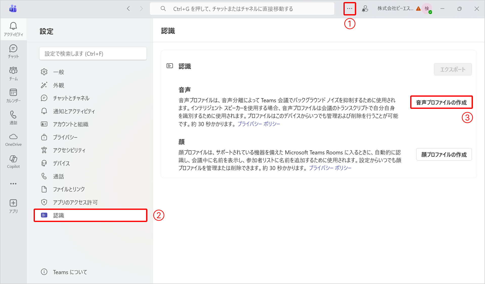 1.Teams の [設定] から、[認識] → [音声プロファイルの登録] をクリックします。