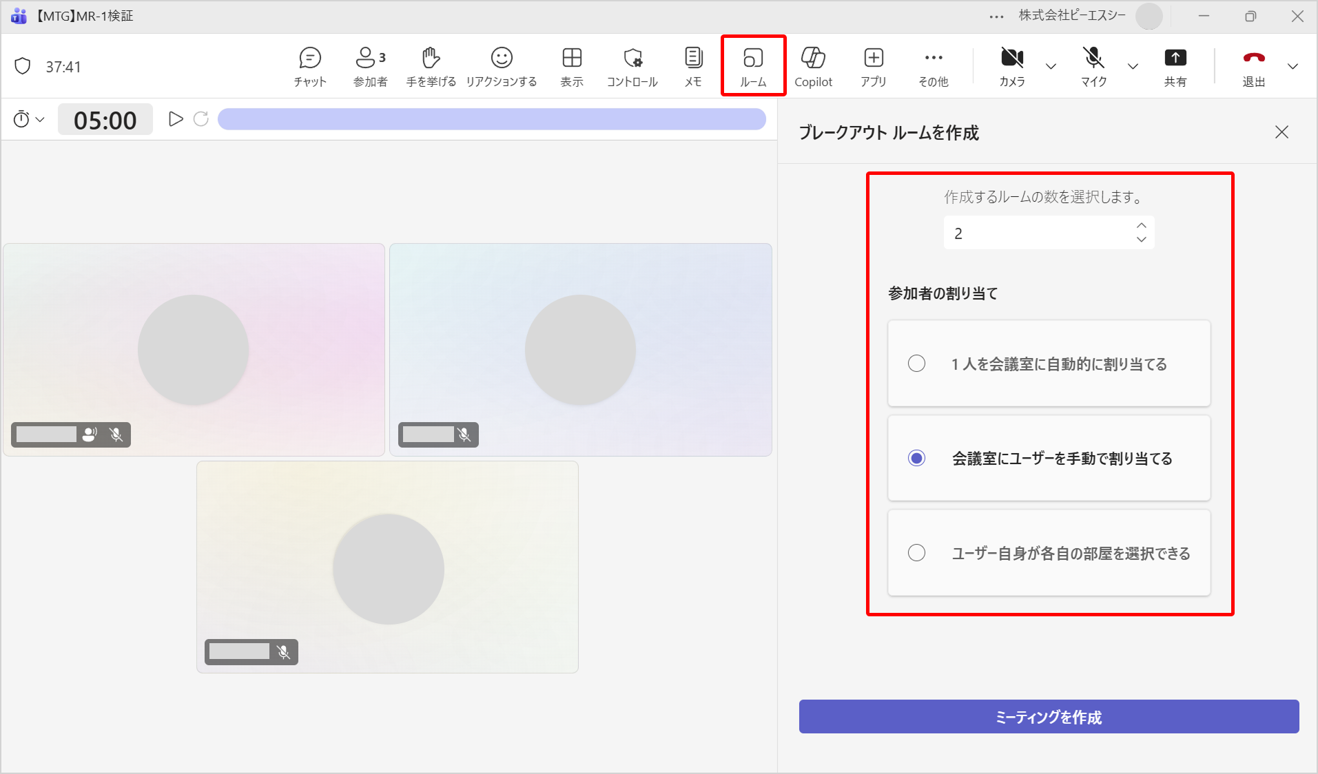 2.作成するルームの数と参加者の割り当て方式を選択し、[ミーティングを作成]をクリックします。