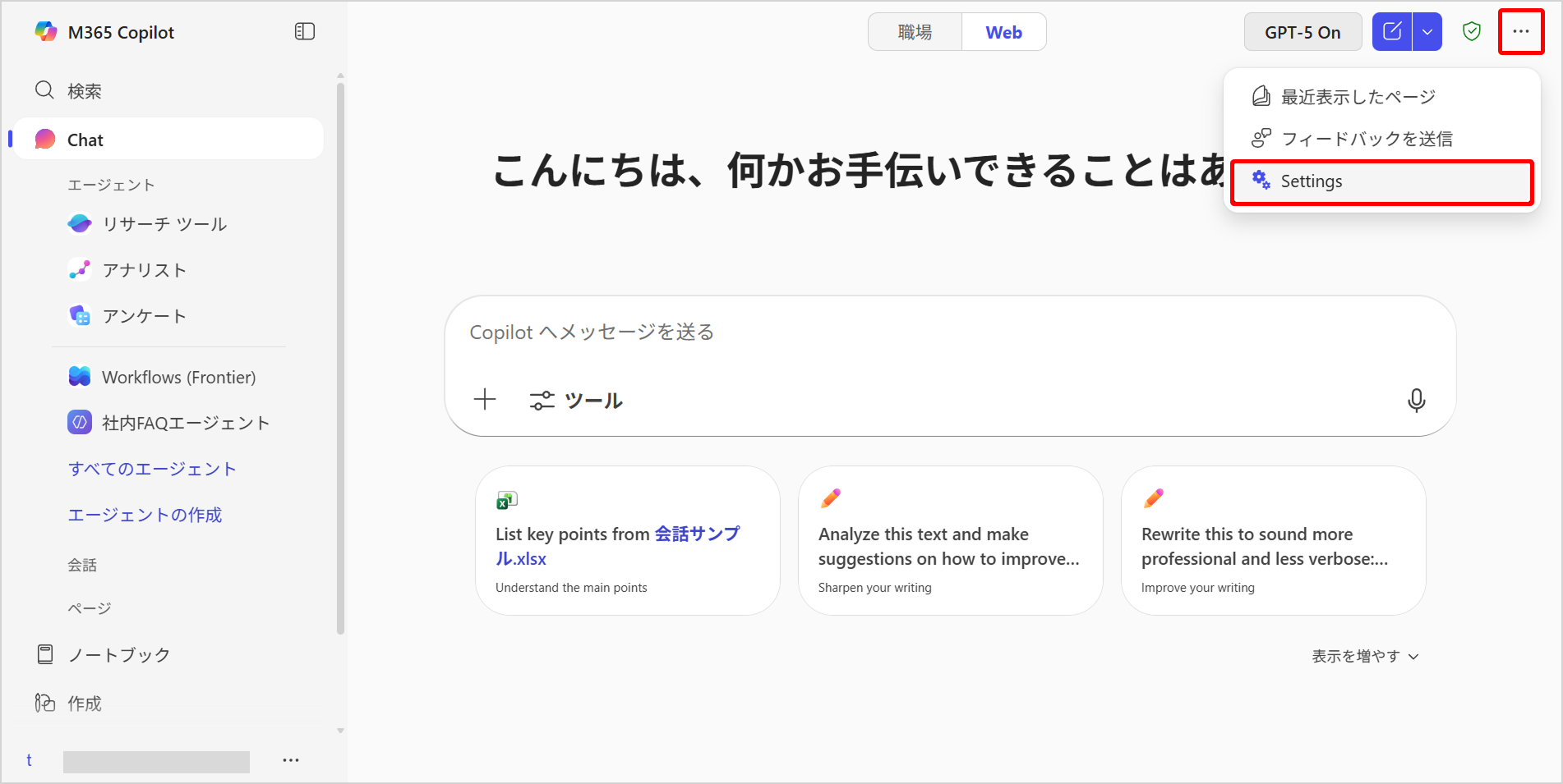 1.Copilot Chatを開き、右上の[…]→[Setting(設定)]をクリックします。