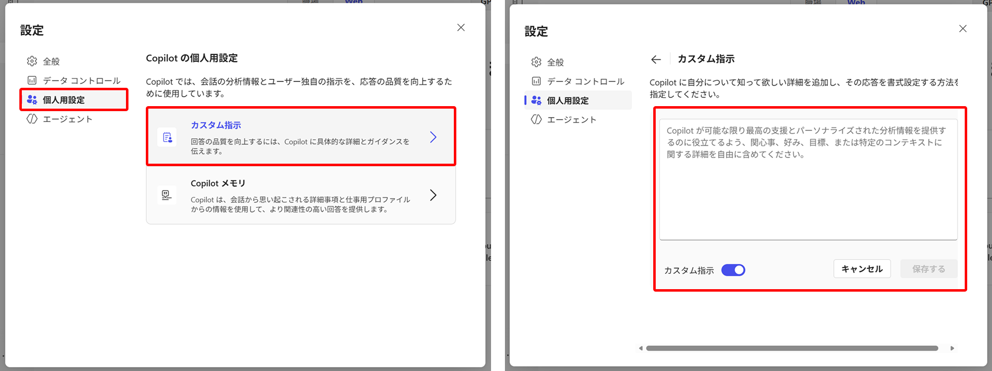 2.[個人用設定]→[カスタム指示]を選択すると、指示内容を入力できます。左下のトグルをオフにすると、カスタム指示を記載していてもそれを適用せずに回答が生成されます。