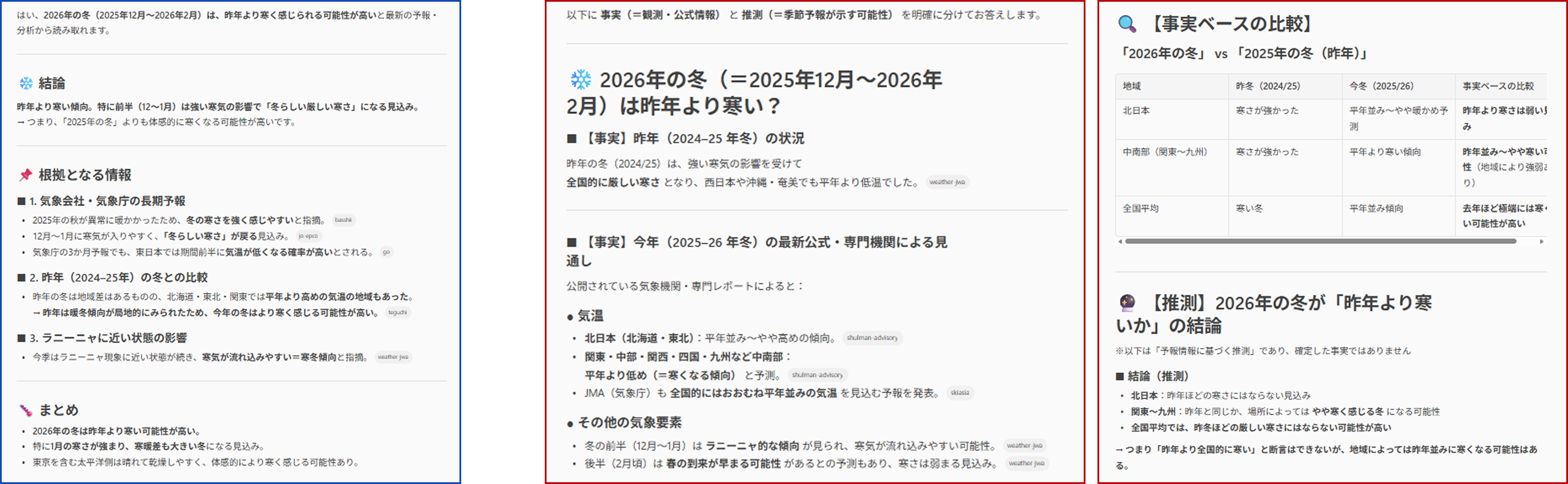※左:追加プロンプトなし 右:「事実と推測を明確に区別してください」と記載