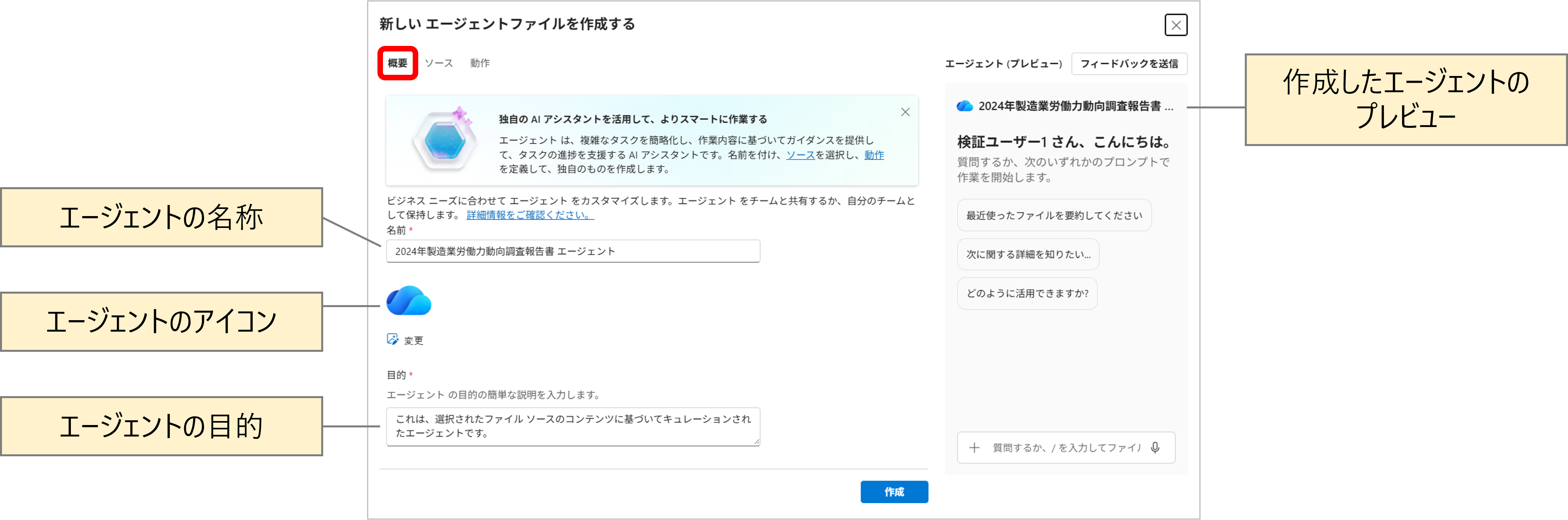 2. [エージェントの作成] をクリックすると作成画面に遷移し、自動で [概要] の設定画面が表示されます。(SharePointエージェントの作成画面とほぼ同じ構成となっています)