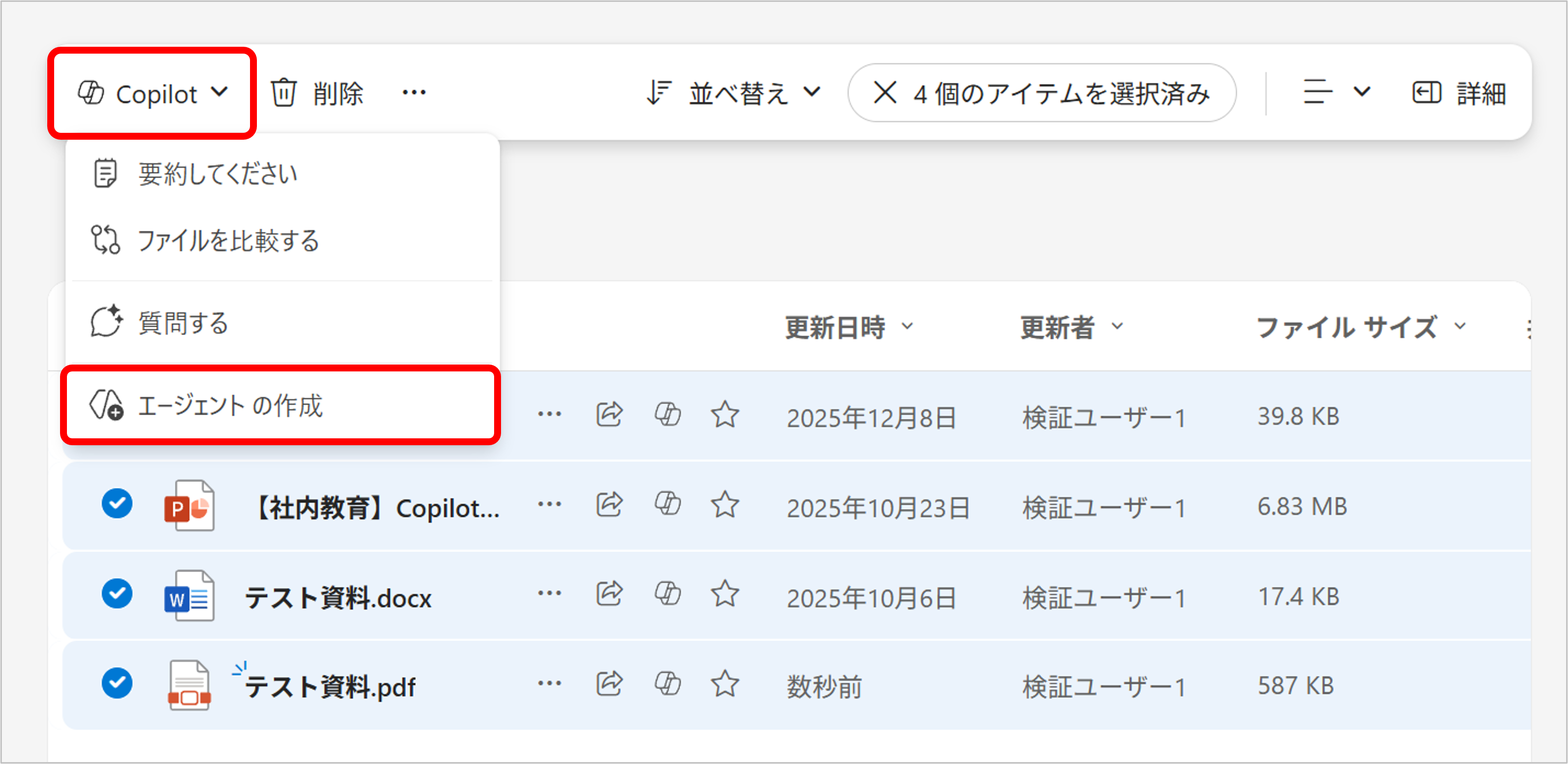※作成時、最初に複数のファイルを選択して、左上の [Copilot] →[エージェントの作成] をクリックいただくことで作成することも可能です
