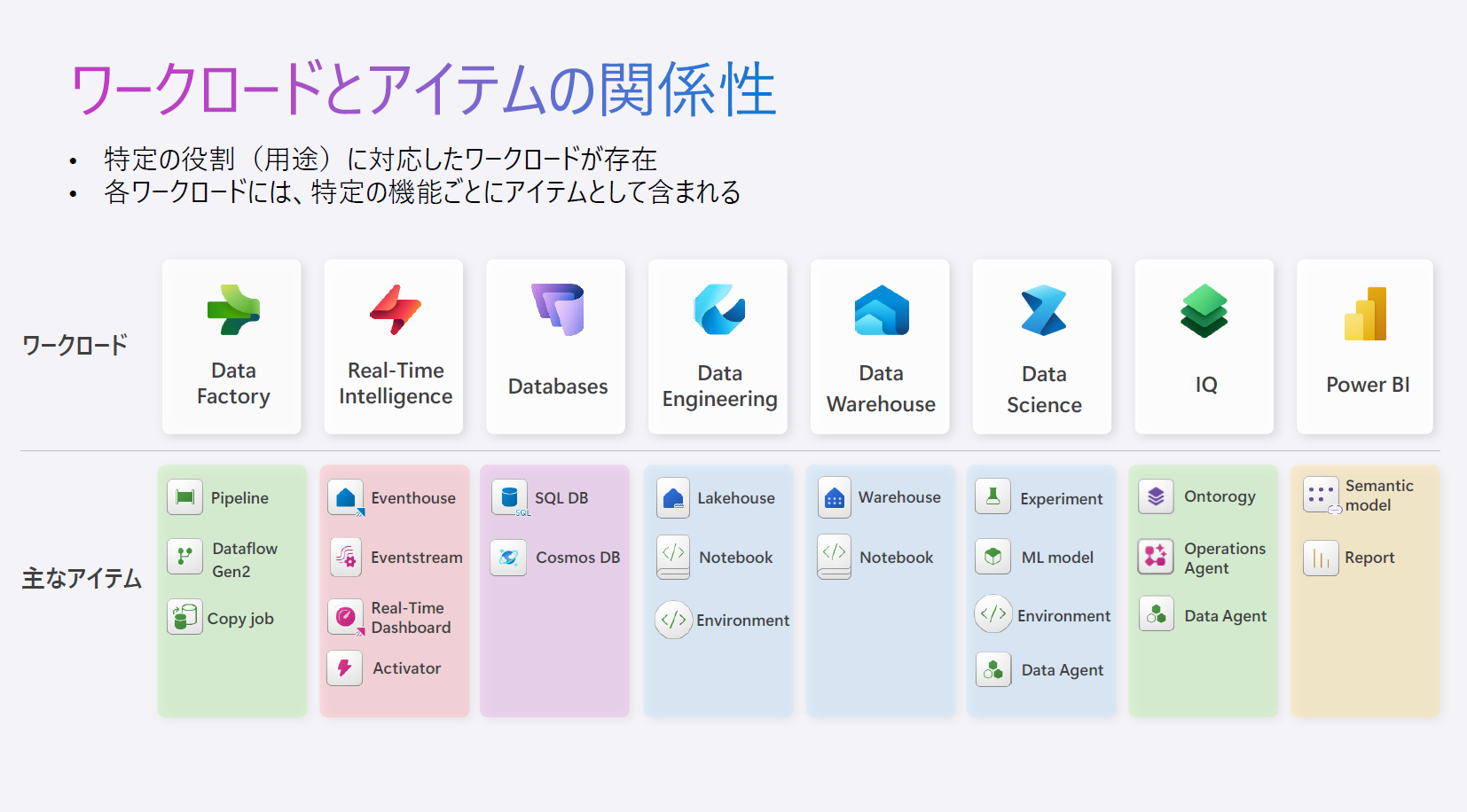Fabric では、データ活用の工程や役割に対応した機能を「ワークロード」として提供します。ワークロードは、目的別に整理された機能の集合であり、入口は異なってもデータはすべてOneLakeを通じて共通管理されます。そのため、工程ごとに別製品を寄せ集めるよりも、連携・統制をシンプルにしやすい設計です。