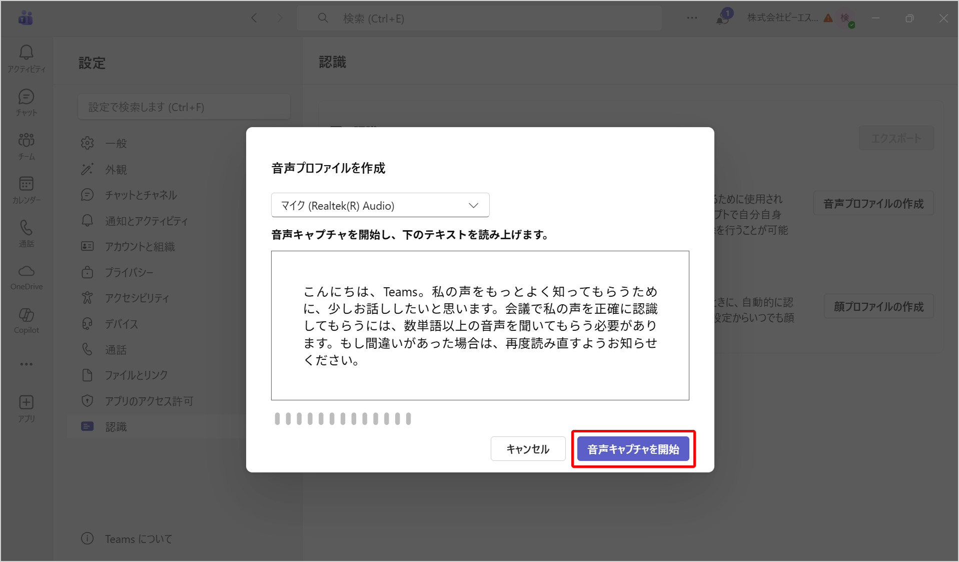 1.Teams の [設定] から、[認識] → [音声プロファイルの登録] をクリックします。