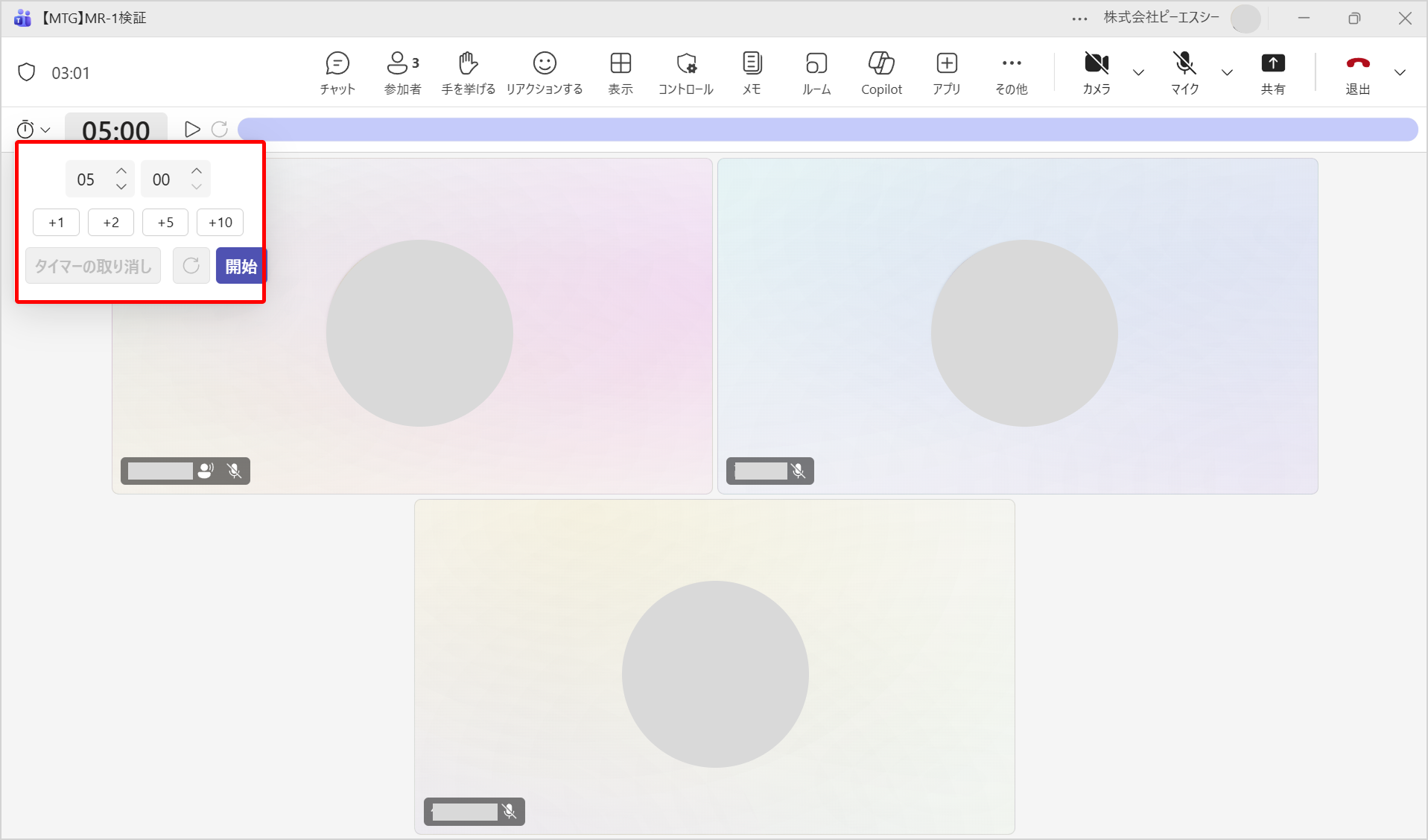 Teams会議中にタイマーを設定し、時間管理をサポートする機能です。このタイマーは一人が設定すれば参加者全員で確認することが可能なので、議題ごとの時間配分やグループワークの管理に役立ち、会議の効率化やメリハリのある進行にもつながります。