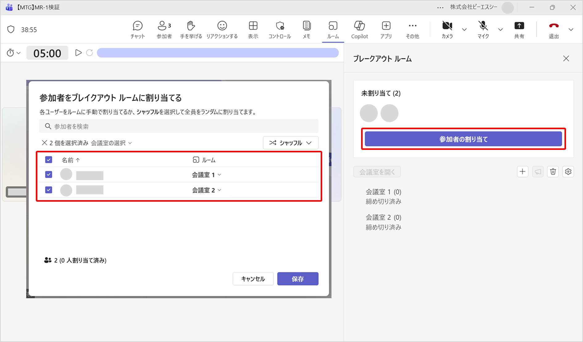 3.手動で割り当てる場合は、[参加者の割り当て]から対象者とルームを選択して[保存]をクリックします。
