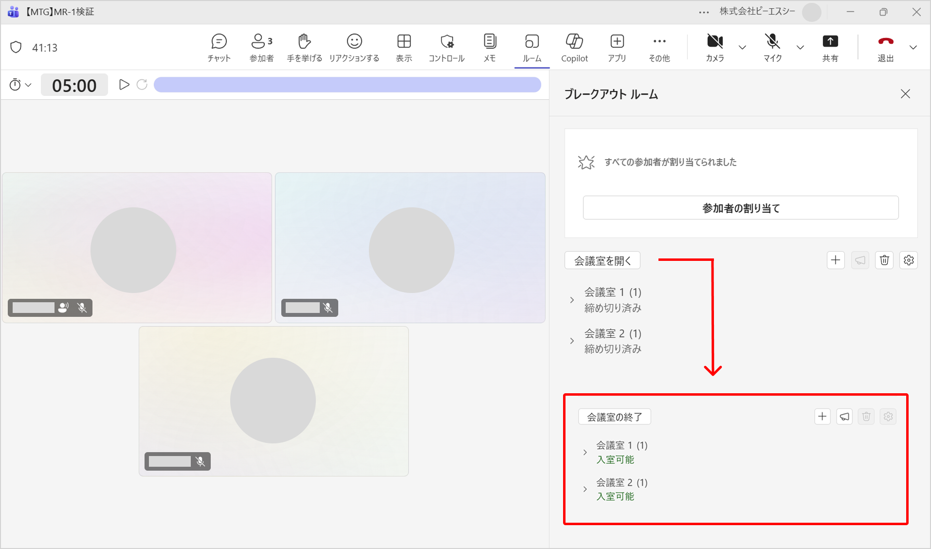 4.[会議室を開く]でブレイクアウトルームを開始、[会議室の終了]で終了させることができます。