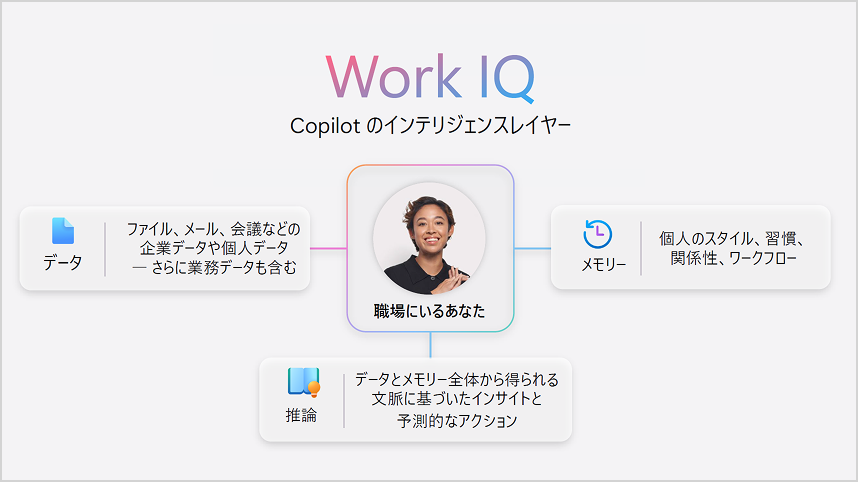 | Work IQ | 業務文脈・個人/組織の履歴を学習・推論。 ユーザーや組織ごとの業務履歴をもとに、状況に応じた最適な提案や支援を実現する。 |