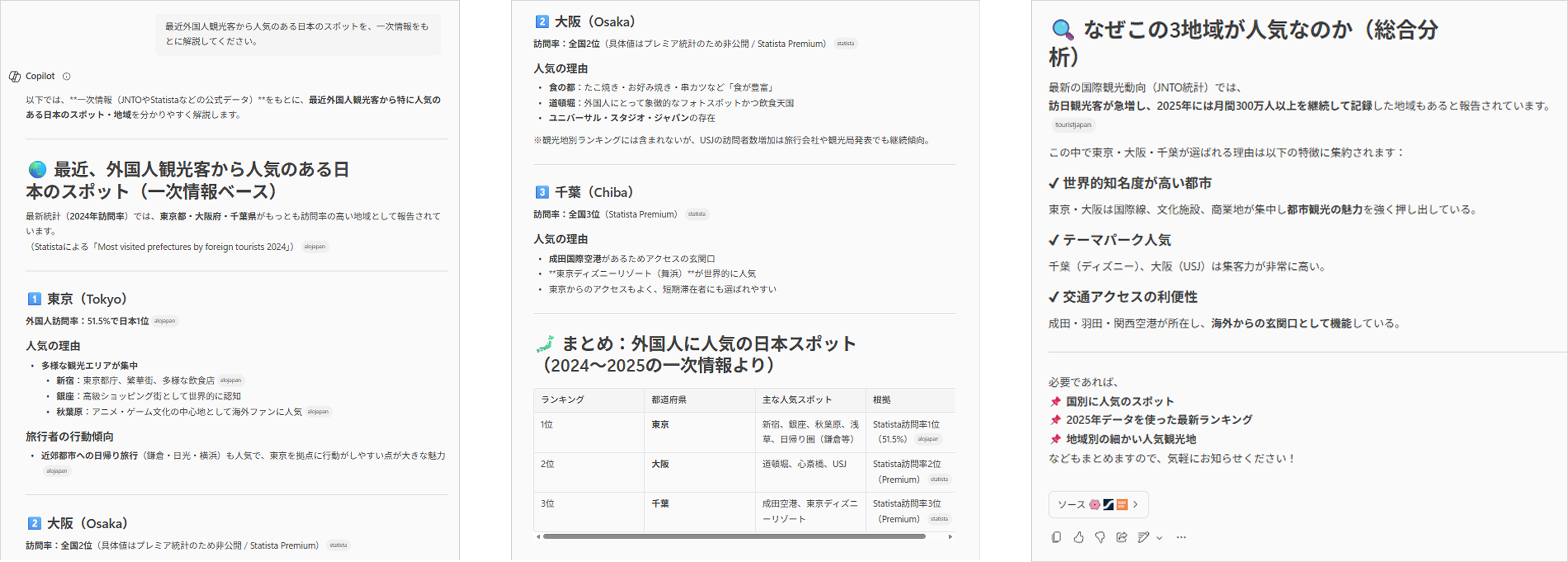 例えば市場調査において、二次情報ベースでは最新データとズレが生じる可能性があります。一次情報を指定することで、Copilotは可能な範囲で“元の事実に近い情報”を参照しようとするため、回答の精度が向上します。