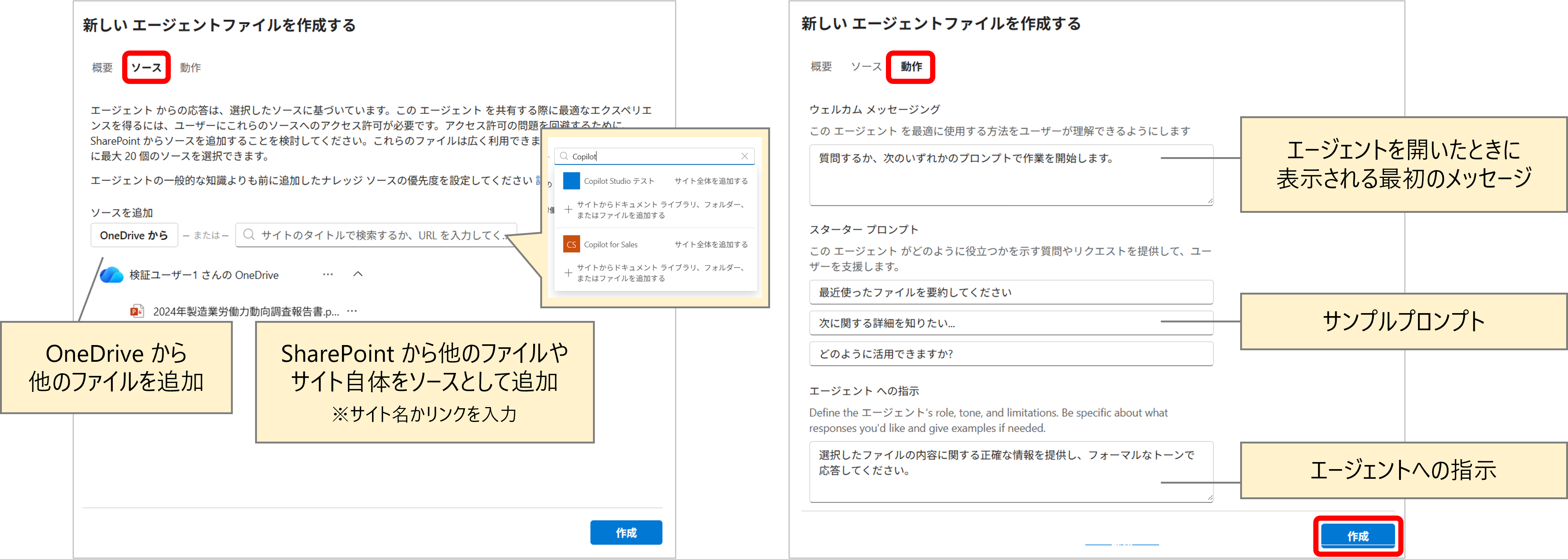※作成時、最初に複数のファイルを選択して、左上の [Copilot] →[エージェントの作成] をクリックいただくことで作成することも可能です