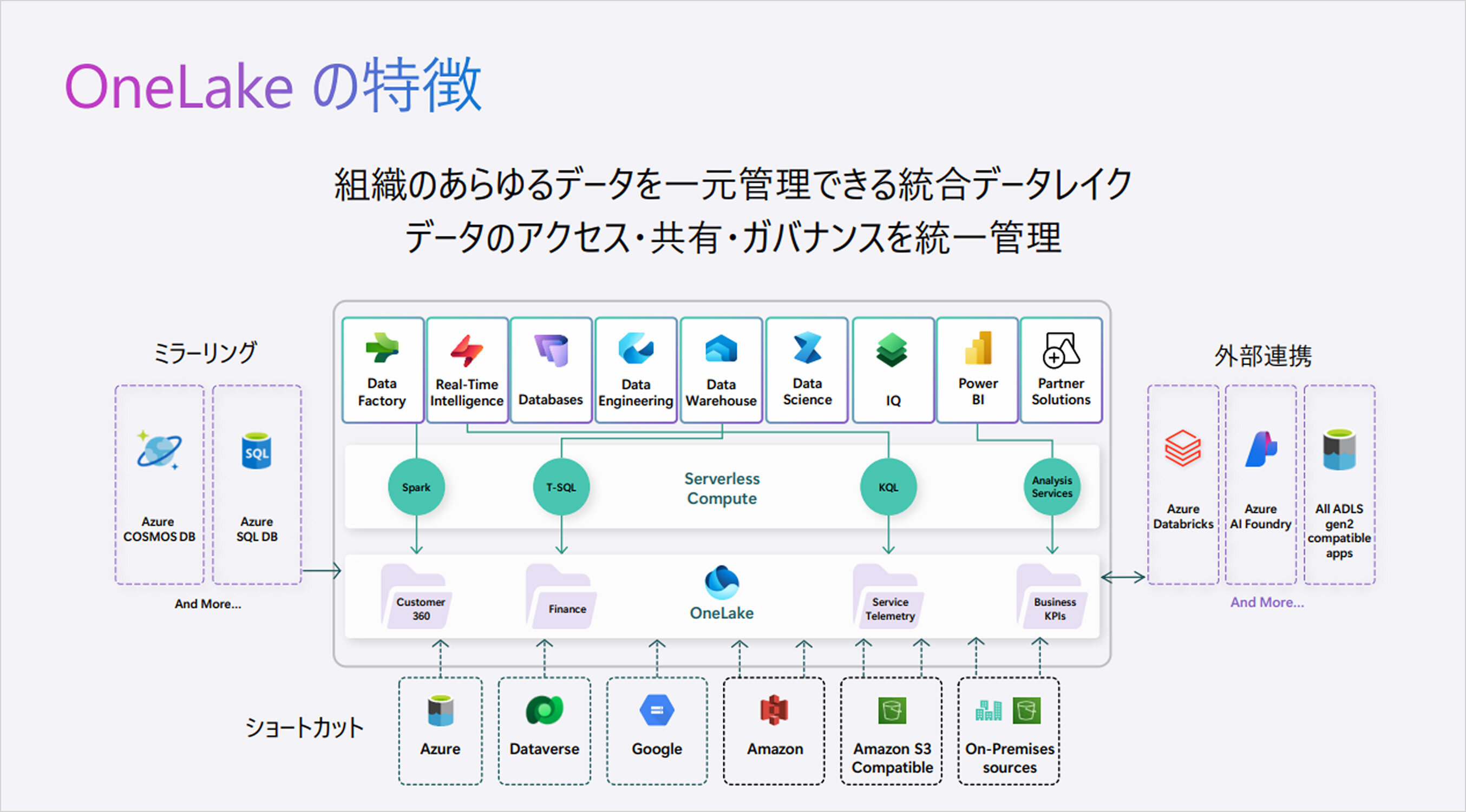 さらに、共通ストレージ基盤として「OneLake」を中心に据え、統一ガバナンスのもとで各機能(ワークロード)が連携する構造になっています。