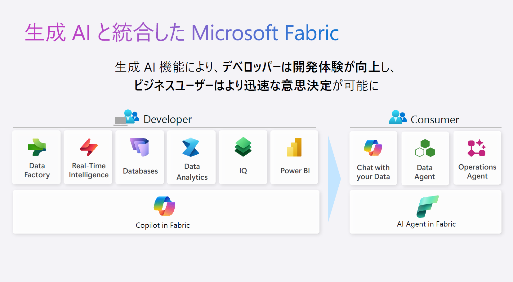 Microsoft Fabric では、生成 AI を特別な専門機能として切り出すのではなく、日々のデータ活用を支える仕組みとして、最初からプラットフォームに組み込んでいます。
